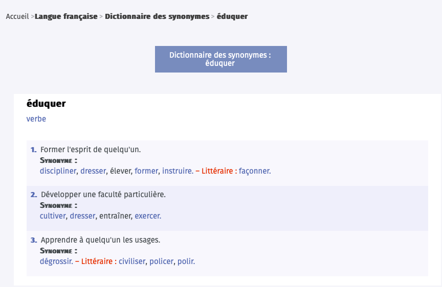 Il conviendra bien entendu de revenir sur le sens des synonymes du verbe éduquer et leurs contextes d’applications. Pour ma part, ma préférence va à un verbe qui n’a pas été cité dans les différentes sources reportées dans cet article… Je vous le livrerai dans un prochain article.