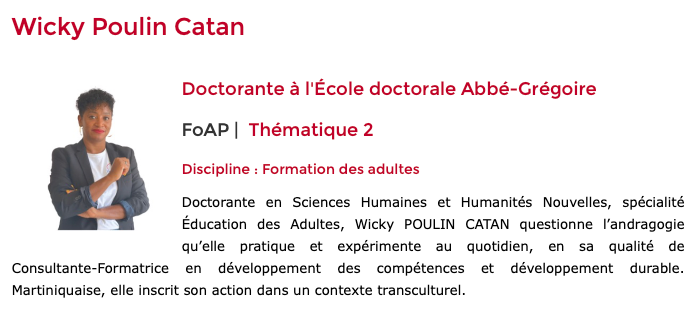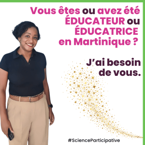 Cette page est une invitation à découvrir et à prendre part aux recherches portées par un-e de nos membres fondateur-rices : Wicky POULIN CATAN, désormais Doctorante en sciences de l’éducation et de la formation – spécialité Éducation des adultes. Elle nous invite à nous interroger sur les modèles éducatifs usités sur notre territoire. Sont-ils aidants, utiles ? Concourent-ils à aux épanouissements des martiniquais-es ?